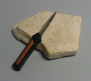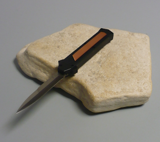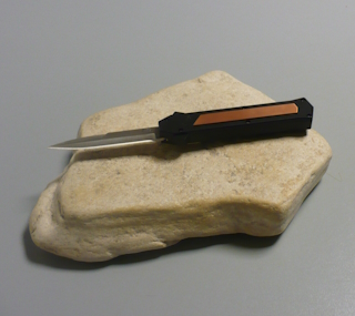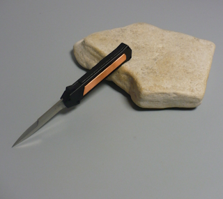 | Coltello a scatto frontale 20,50 Cm.con impugnatura in alluminio teflonato nero con inserto in rame Lama baionetta |