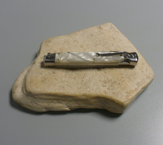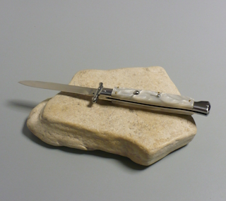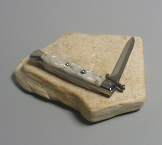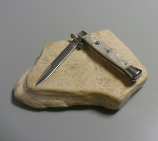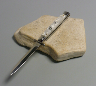 | Coltello a scatto 28 Cm.con impugnatura in perloide bianca ( Imitazione madreperla ) Lama baionetta Ogni pezzo e'unico realizzato a mano dall'inizio alla fine da AKC Word Questo coltello e'stato prodotto per mantenere una promessa "Ogni pezzo firmato AKC Word"si deve riconoscere dal suo design elegante e dal suono potente del suo scatto di apertura |