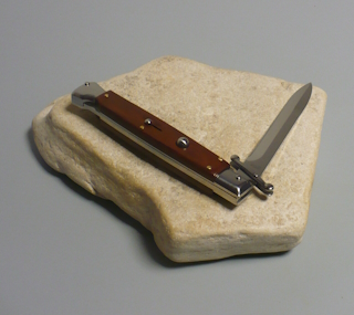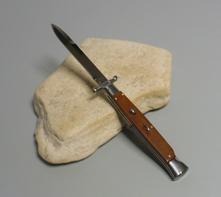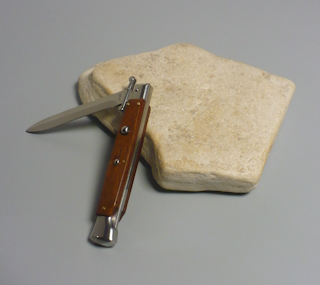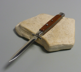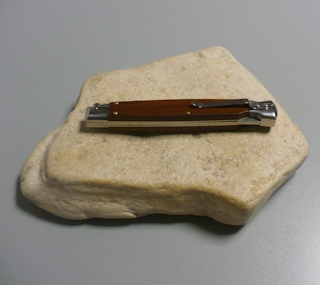 | Coltello a scatto 28 Cm.con impugnatura in legno palissandro chiaro Lama baionetta Ogni pezzo e'unico realizzato a mano dall'inizio alla fine da AKC Word Questo coltello e'stato prodotto per mantenere una promessa "Ogni pezzo firmato AKC Word"si deve riconoscere dal suo design elegante e dal suono potente del suo scatto di apertura |