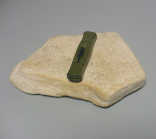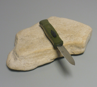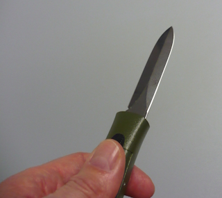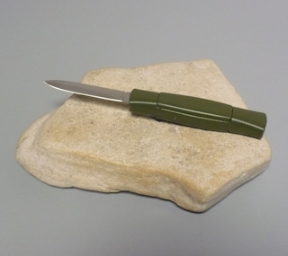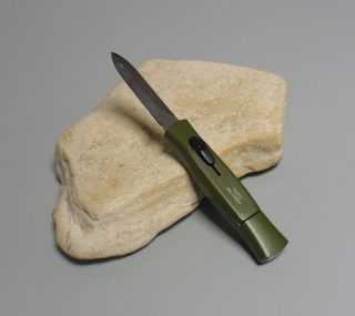 | Coltello a scatto frontale 20,50 Cm.con impugnatura in acciaio teflonato verde nato Lama dagger doppio filo Questo modello di coltello fa parte del patrimonio culturale della citta' di Maniago ( Friuli Venezia Giulia - Italia ) |