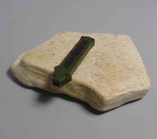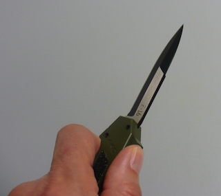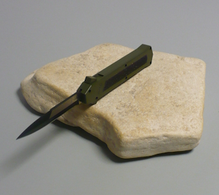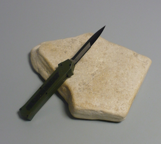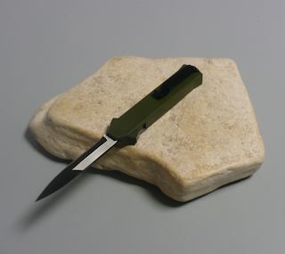 Coltello a scatto frontale 20,50 Cm.con impugnatura in alluminio teflonato verde nato con inserto in graffite nera Lama baionetta |