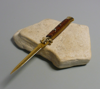 | Coltello a scatto 28 Cm.con impugnatura in legno di serpente ( Snake wood ) Lama dagger filo singolo ( Teflonata in bagno di oro 18K ) Produzione limitata ( 10 pezzi ) Produzione Excellent ( La base della lama e'di 4,5 mm. ) Ogni pezzo e'unico realizzato a mano dall'inizio alla fine da Frank Beltrame Questo coltello e' stato prodotto per mantenere una promessa " Ogni pezzo firmato Frank Beltrame "si deve riconoscere ad occhi chiusi ascoltando il suono inconfondibile del suo scatto potente e preciso |