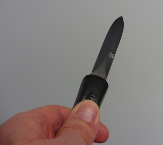 | La Lama esce frontalmente spingendo leggermente il pulsante in avanti La lama si chiude rientrando spingendo leggermente il pulsante verso dietro |