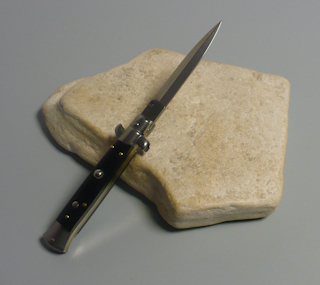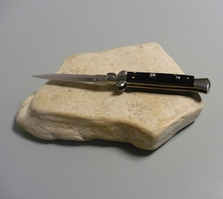 | Coltello a scatto 23 Cm. con impugnatura in polimero imitazione corno scuro Lama dagger filo singolo Produzione Excellent ( La base della lama e'di 4,5 mm. ) Ogni pezzo e'unico realizzato a mano dall'inizio alla fine da Frank Beltrame Questo coltello e' stato prodotto per mantenere una promessa " Ogni pezzo firmato Frank Beltrame "si deve riconoscere ad occhi chiusi ascoltando il suono inconfondibile del suo scatto potente e preciso |
