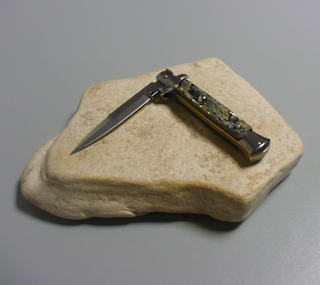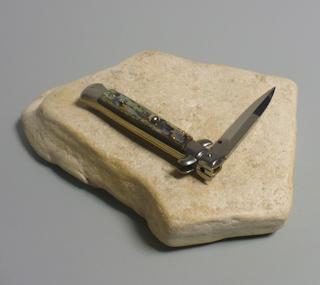 Coltello a scatto 23 Cm.con impugnatura in madreperla di abalone originale Lama baionetta Produzione Excellent ( La base della lama e'di 4,5 mm. ) Ogni pezzo e'unico realizzato a mano dall'inizio alla fine da Frank Beltrame Questo coltello e' stato prodotto per mantenere una promessa " Ogni pezzo firmato Frank Beltrame "si deve riconoscere ad occhi chiusi ascoltando il suono inconfondibile del suo scatto potente e preciso |