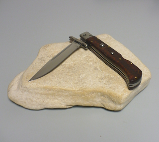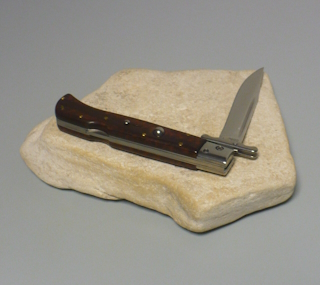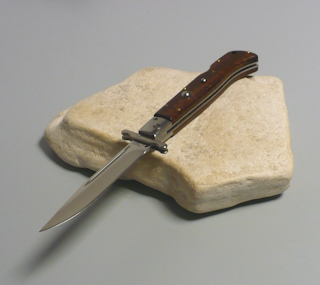 | Coltello a scatto 28 Cm.con impugnatura in legno di serpente ( Snake wood ) Lama taglio classico clip point Ogni pezzo e'unico realizzato a mano dall'inizio alla fine da AKC Word Questo coltello e'stato prodotto per mantenere una promessa "Ogni pezzo firmato AKC Word"si deve riconoscere dal suo design elegante e dal suono potente del suo scatto di apertura |