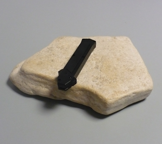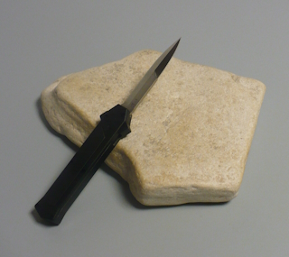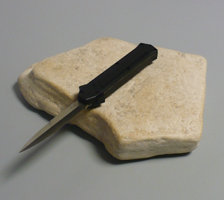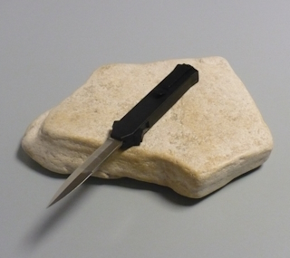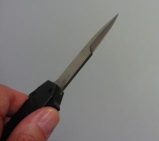 Coltello a scatto frontale 20,50 Cm. impugnatura in alluminio teflonato nero con inserto in acciaio nero Lama baionetta |