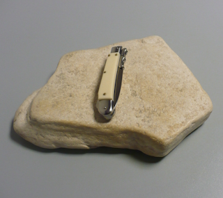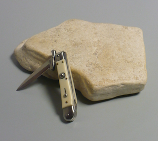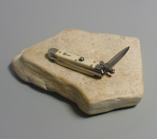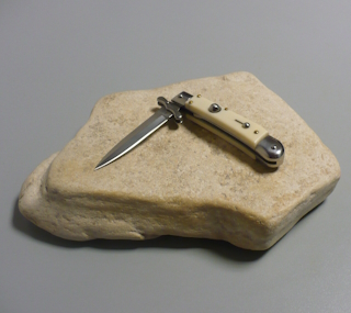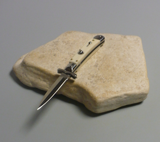 Coltello a scatto 18,50 Cm.Mod.Swinguard con impugnatura in polimero imitazione avorio bianco Lama dagger filo singolo Ogni pezzo e'unico realizzato a mano dall'inizio alla fine da AKC Word Questo coltello e'stato prodotto per mantenere una promessa "Ogni pezzo firmato AKC Word"si deve riconoscere dal suo design elegante e dal suono potente del suo scatto di apertura |