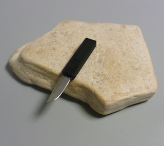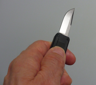 Coltello a scatto frontale 13 Cm.con impugnatura lavorata in alluminio teflonato nero Lama taglio classico spear point |