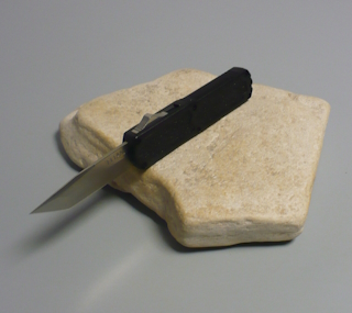 Coltello a scatto frontale 21 Cm.con impugnatura in alluminio aeronautico teflonato nero con inserti in grafite nera Lama american tanto |