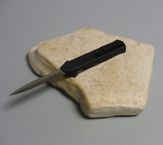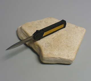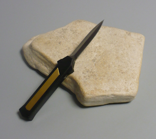 | Coltello a scatto frontale 20,50 Cm.con impugnatura in alluminio teflonato nero con inserto in ottone Lama dagger doppio filo |